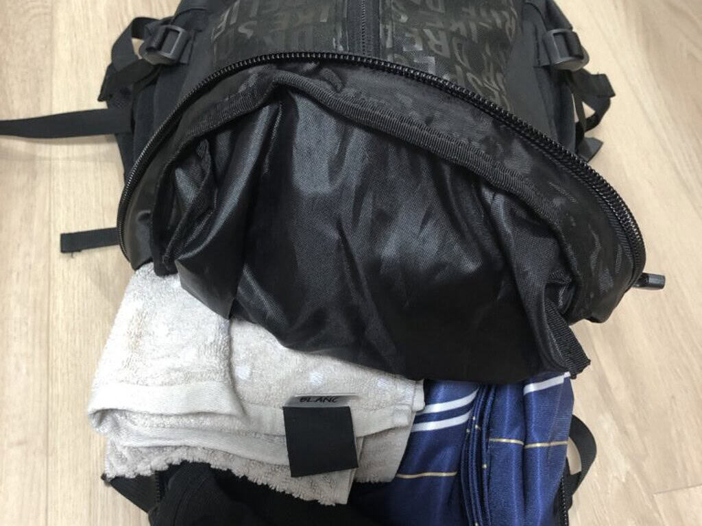 娘が試合の時に持っていくもので収納量を検討してみました。スポーツタオルが2枚、ユニフォーム上下、練習着上下、スウェット上下、膝当て、1Lの水筒を収納してみました!!
