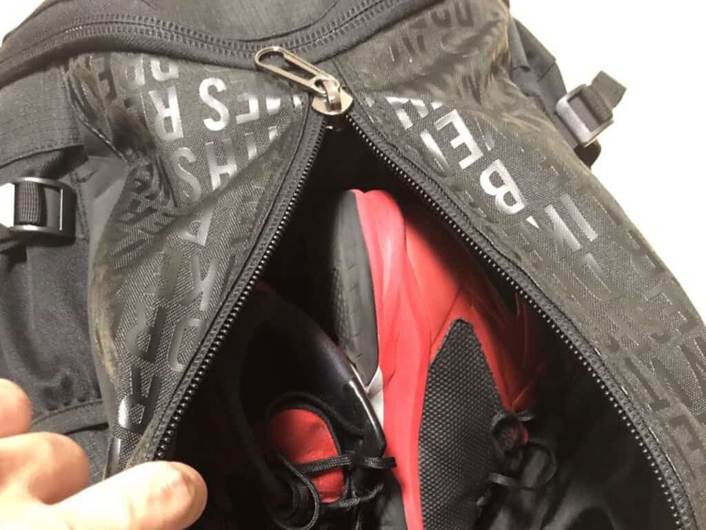 シューズポケットに入っているのは娘用の22.5cm GELPRIMESHOT SP4です。私の26.5cmのジョーダン5も余裕で収納できました。ボールポケットには中学女子向けの5号球が入っています。7号球でも余裕で収納できますよ!