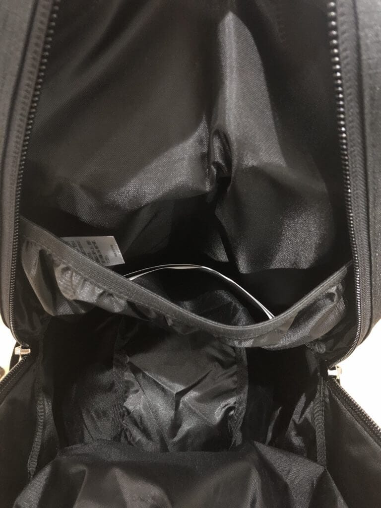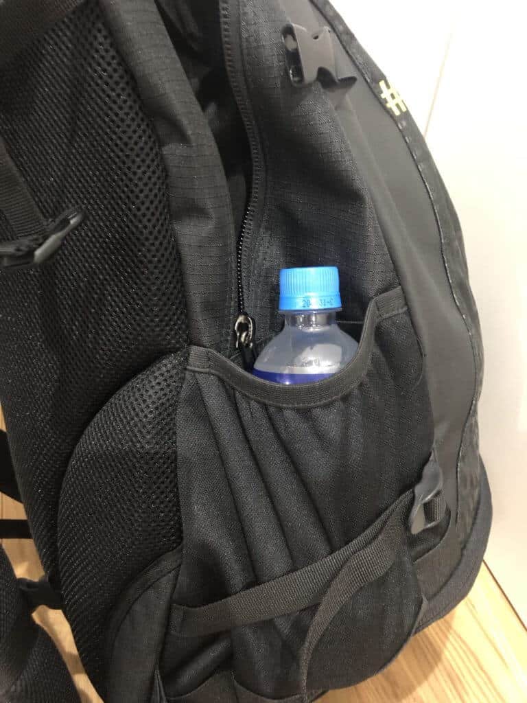 両サイドのポケットには500mlのペットボトルがすっぽり入る仕様で、ベルトで固定すれば逆さまにしても落ちにくいようになっています。考えてるな〜!! 分かりにくいですが、右は内部の区分けポケットです。背中側に設けてあり、小物の収納に役立ちそう。